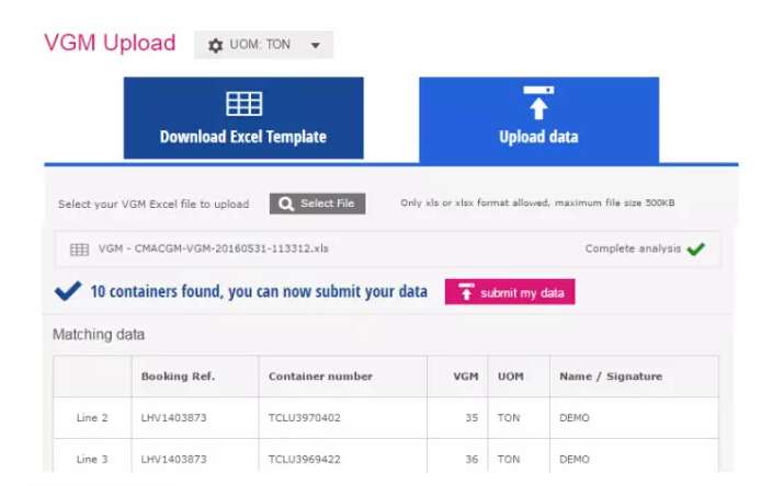 該平臺符合驗證總重量申報要求,將收集到的驗證總重量、編輯并和碼頭共享數(shù)據(jù)。托運人可通過提交裝運指令時提供驗證總重量信息或單獨提交申報。