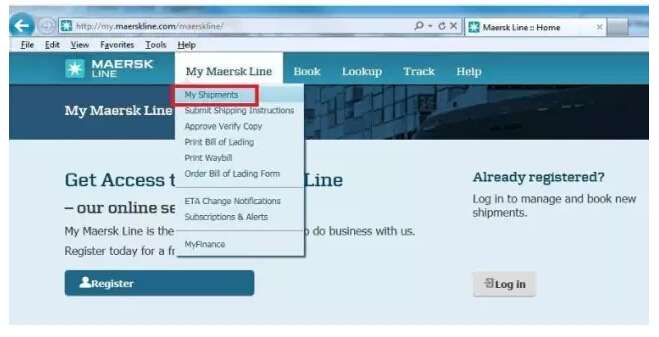 1)登陸 my.maerskline.com,點擊“My Maersk Line”下面的”My Shipments”