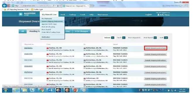 5)與提單補料一同提交,進入“我的馬士基”,選擇“Submit Shipping Instructions”