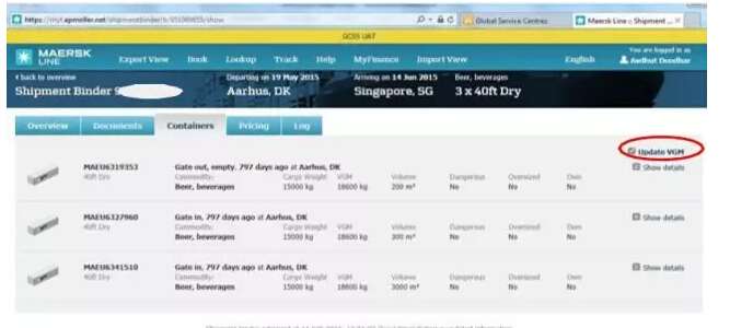 ——客戶通過任何一種渠道發(fā)送的VGM都可以在“我的馬士基”某訂艙號的集裝箱項下顯示馬士基航運成功接收/ 發(fā)送的VGM。